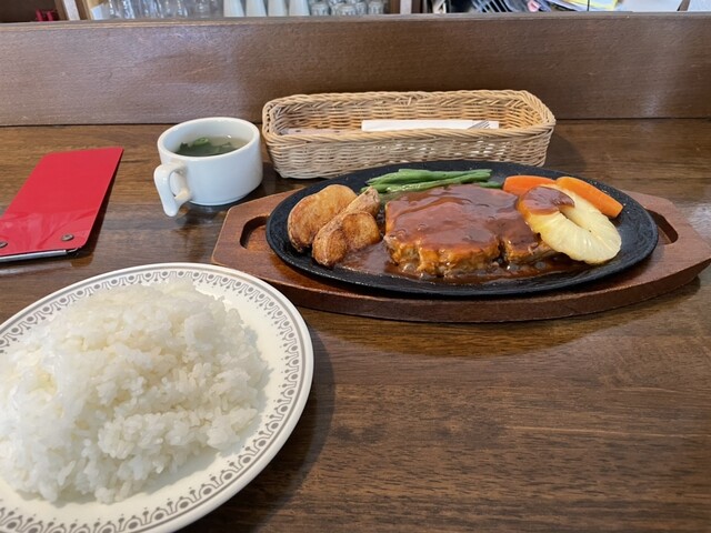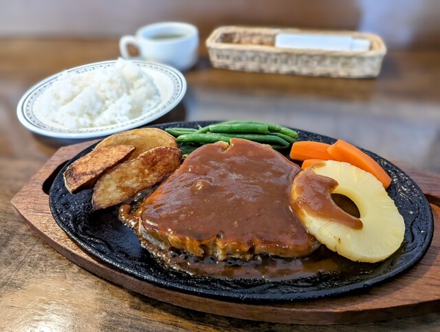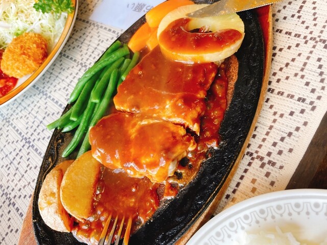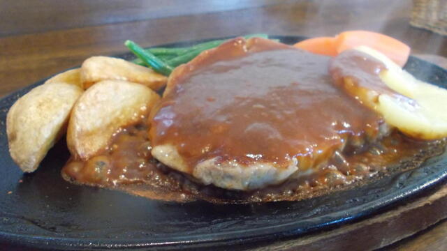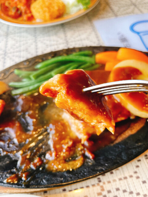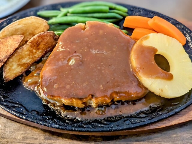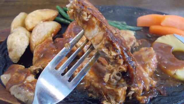 ポークソテーはジュウジュウ熱々の鉄板で提供され、フライドポテト、インゲン、ニンジンのグラッセが並べられた王道の盛り付け方です。