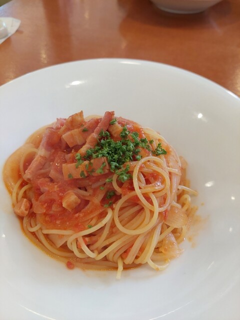 パスタはベーコンと玉ねぎのトマトソースをチョイス、本日の1皿は1つは大山鶏の低温ロースト サラダ仕立て、1つは若鶏のグリル サラダ添え(プラス330円)をチョイス。