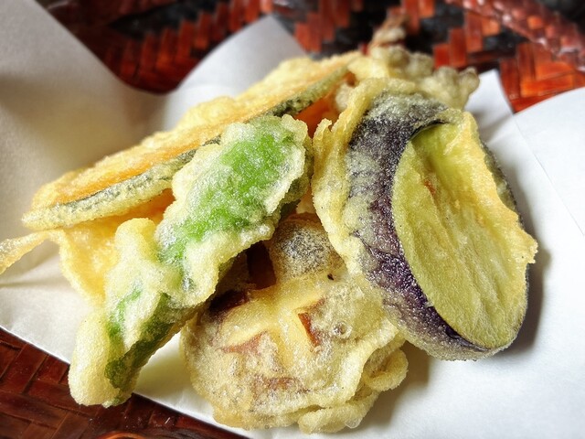 季節の天ぷらが盛りだくさんの定食でした。きのこ、きのこ、ナス、ししとう、エビ、さつまいも。