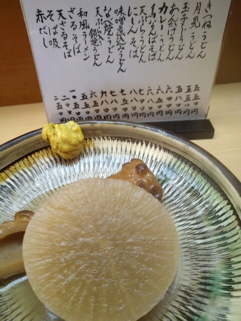 おでんの香りに負けて、だいこんとちくわを追加注文。1個120円なんてうれしい。