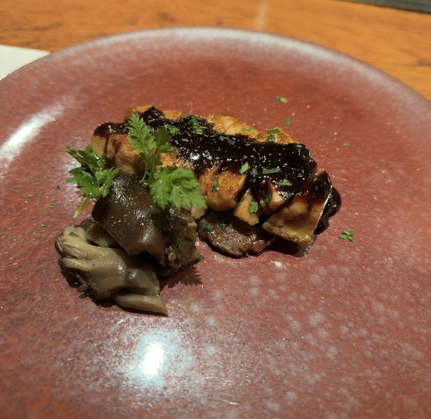 程よく脂ののった柔らかな黒毛和牛フィレステーキ。肉厚なオマール海老テール(尾の身)は発酵バター・白ワイン・ケイパー・レモン果汁・オマール海老のおミソと卵のソースで。収穫したばかりの力強いお野菜と共にお楽しみ下さい。 ステーキは+4000円にて近江牛シャトーブリアンステーキに変更できます。 (19:30以降のご予約や5名様以上のご予約はお電話にてお願いいたします)