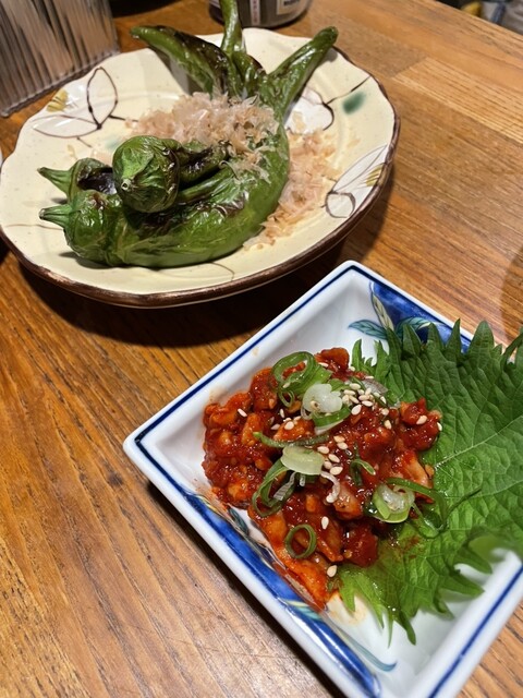 平日の二軒目に。立ち飲みと座りが選べます。座りは満席でしたので立ち飲み。料理とお酒のメニューがとても多くクオリティも高いお店です。サク飲みだったので焼き万願寺とうがらしとチャンジャを注文。明日が休みな...