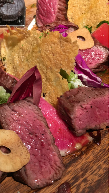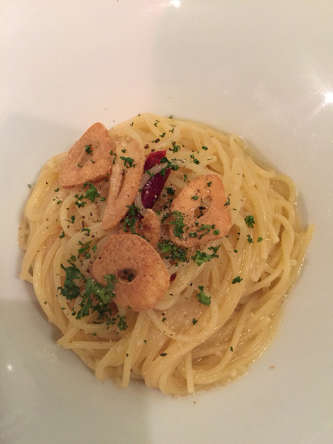 メニューを見る前から「今日は肉!」の気分だったので迷わず牛赤身肉のタリアータをオーダー。「野菜も付いてて結構ボリュームありますよ」とスタッフさんに教えてもらったのでパスタはシンプルなペペロンチーノを。