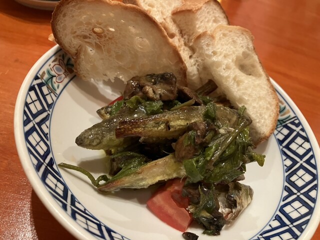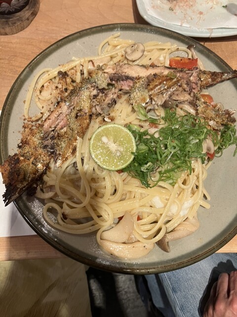 旬でおすすめの秋刀魚のコンフィのリングイネ、自家製秋刀魚のアンチョビとウフマヨ、メヒカリの唐揚げ、舞茸天ぷら、小芋の唐揚げを...