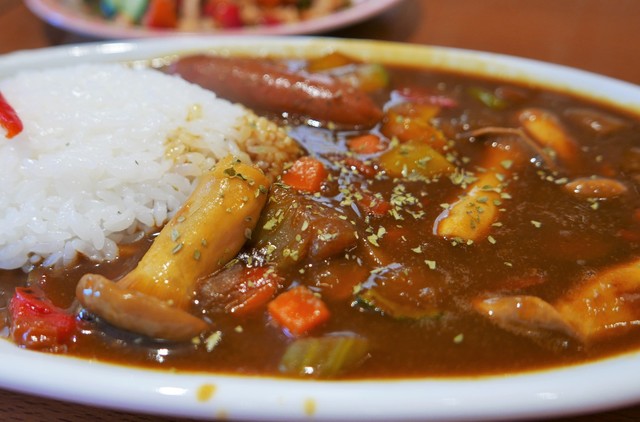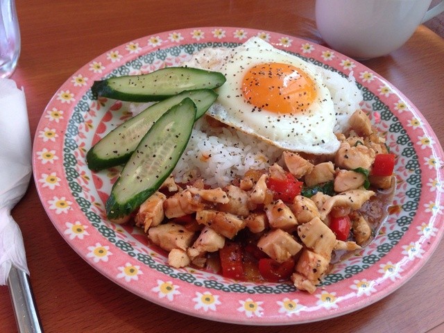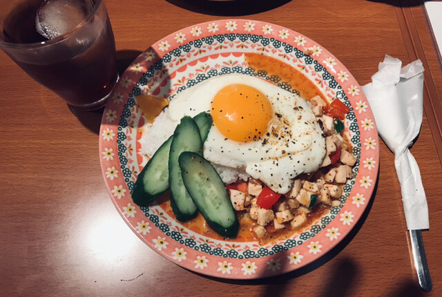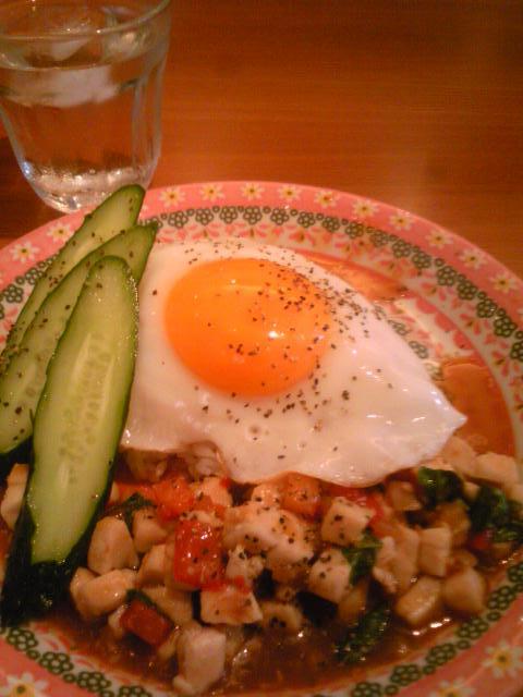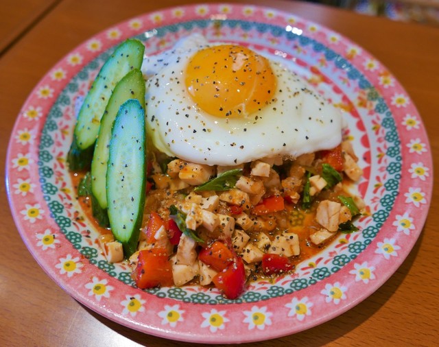 タイの屋台料理「ガパオ」を、日本人向きにアレンジました。「彩り野菜カレー」とともに当店の人気メニューです♪ |