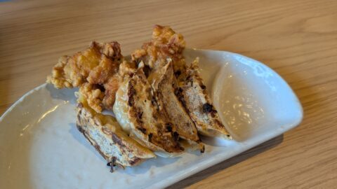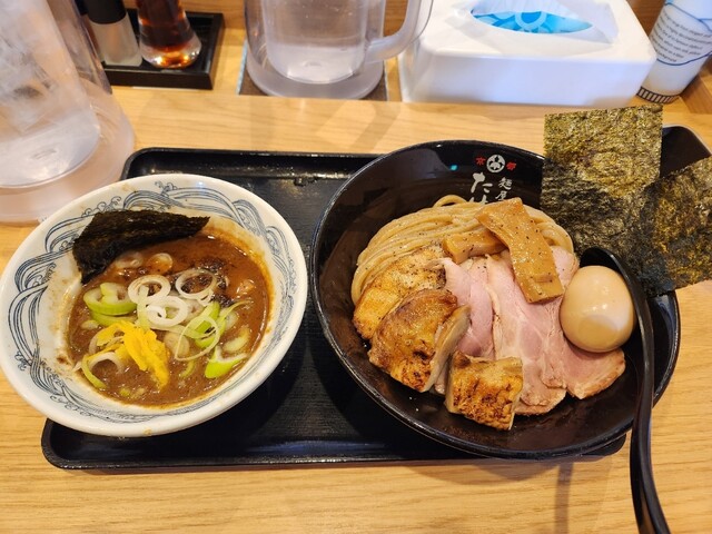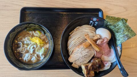 仕事終わりのランチタイム時に滋賀県草津市で車を走らせていたら京都の名店が「麺屋たけ井草津店」出店されていたのですね。知らなかったので早速駐車場に入りました。複合施設の駐車場でも麺屋たけ井草津店さんの前は満車でした。店内を覗いてみたらすでに10人待ちです。券売機で特性つけ麺大を選んでサイドメニューに焼き飯、餃子、唐揚げの食券も購入。