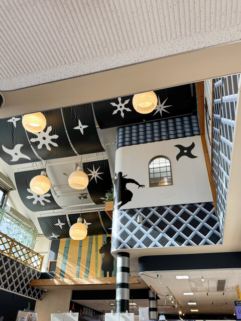 建物の外装、内装に忍者姿や手裏剣等の意匠が施されています