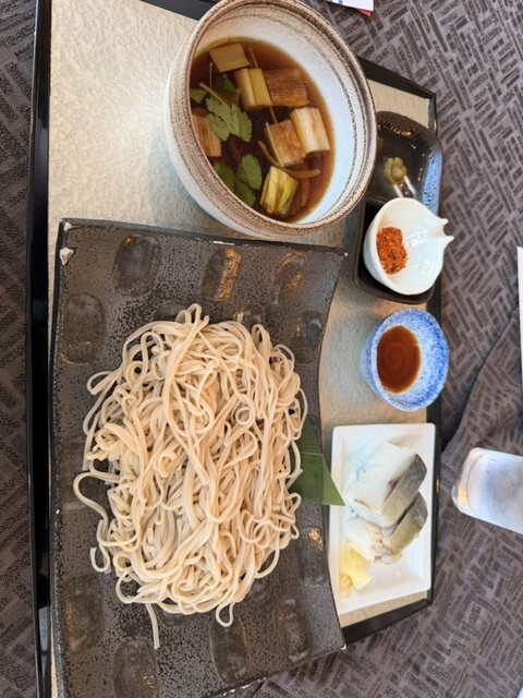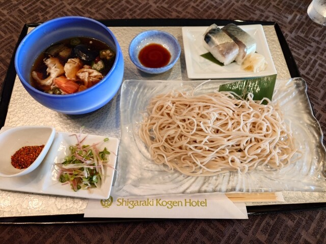 牛バラと桜海老のつけ蕎麦と鯖寿司