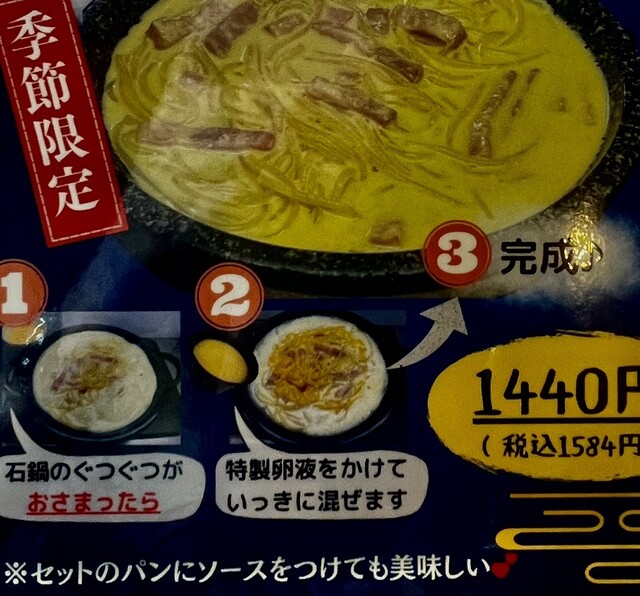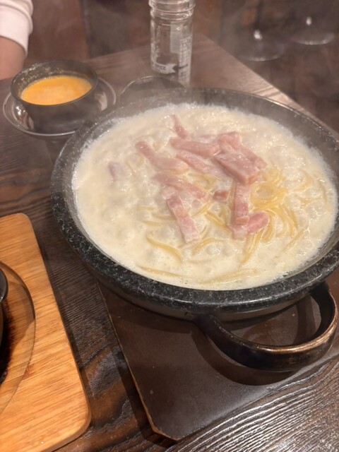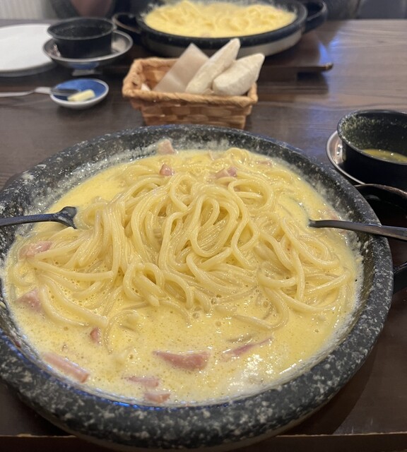 噂通りのもちもちパスタで、あつあつの石焼きで美味しくいただきました。