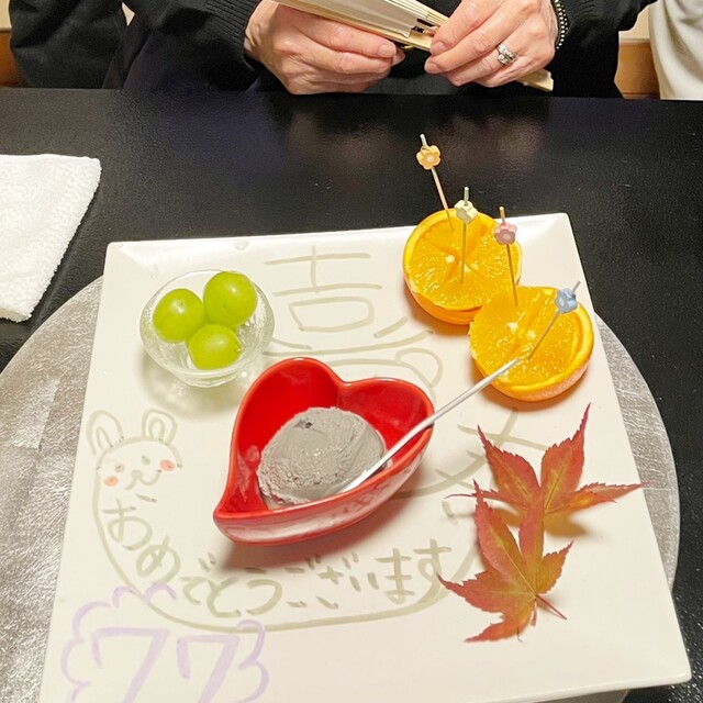 ひとつひとつのお皿の盛り付けも季節を感じさせるあしらいがあり、お肉もさることながら、お刺身も大変美味しかったです。美しいお料理と味に感激していると、最後デザートが花火と共に登場し、お店の方より喜寿のお祝いなのでと、紫のちゃんちゃんこと帽子と扇子を用意してくださり記念撮影!