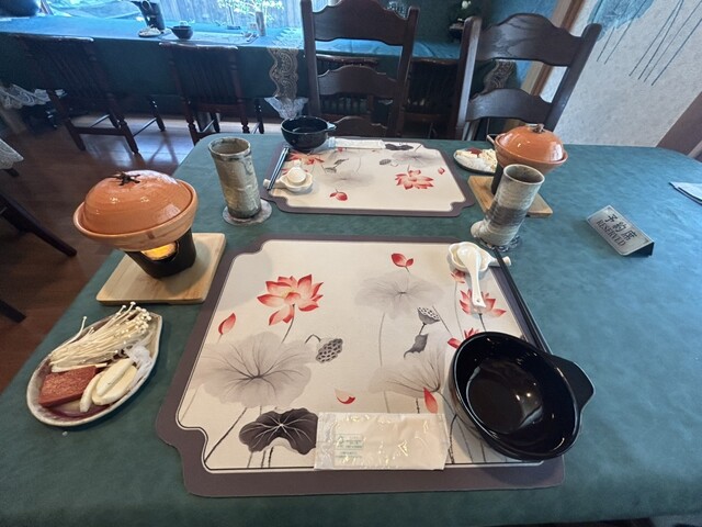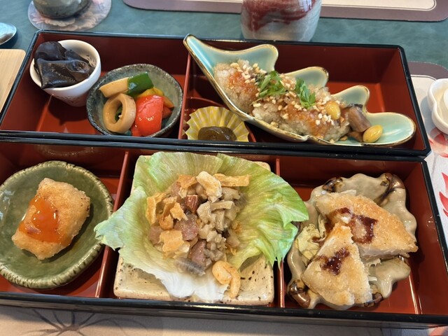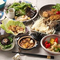 ■前菜 前菜3品 ■お凌ぎ ベジイカパプリカ炒め ■揚げ物 キノコ、野菜 ■蒸し物/サラダ 蒸し野菜 ■鍋物 一人薬膳小鍋 ■強肴 麻婆豆腐 ■旬菜 干貝焼鳥参(椎茸あわびなまこ甘煮) ■強肴 黒胡椒牛柳(黒コショウ牛肉風ステーキ) ■水物 本日のデザート ■お開き 高山杉渓烏龍茶