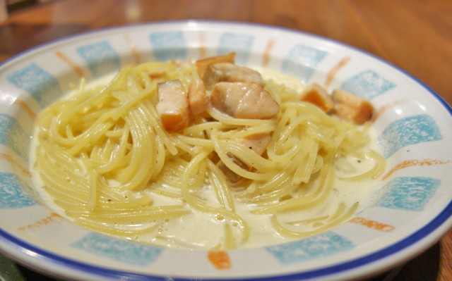 カニの甲羅付きのパスタです。甲羅はただの飾りなので、食事開始即皿の端などに追いやられますがピザを食べるときのタバスコ入れなどに使えます。