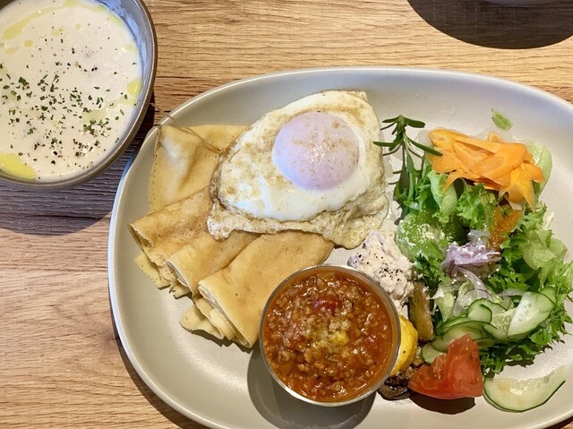 BIWAKO BIENNALEの見学の途中に寄らせて頂きました。近江八幡市街を少しだけ外れたところにあるので、お昼過ぎの時間に入りましたが先客は1組だけでした。ただ13:00過ぎに出る時には満席でしたが。良いタイミングで入店しました。近江牛を使っているメニューが多くあり、迷いましたが、焼肉のおぼんに。クレープが有名なようでしたが、ちょっと昼食にはそんな感じではなくご飯とのセットにしました。地元の野...