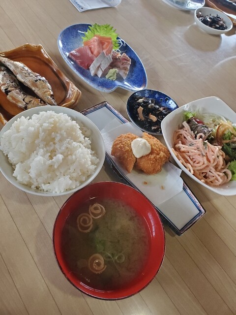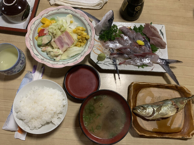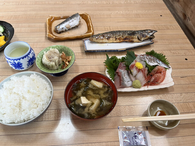 お刺身、焼き魚、魚の煮付け、サラダ、小鉢2つ、ご飯、味噌汁、漬物がつきます。