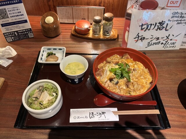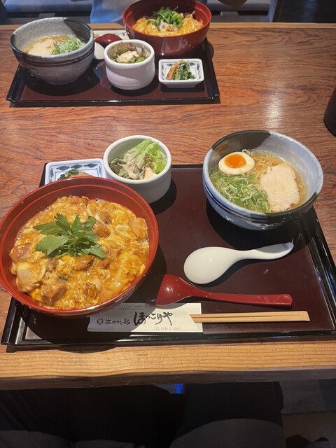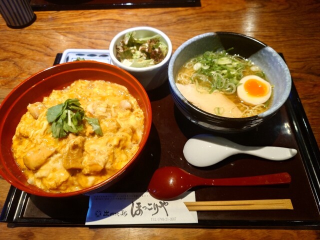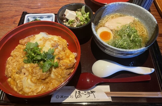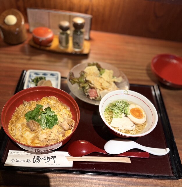 ランチメニューの比内地鶏の親子丼・ラーメン(ハーフ)セット、サラダ・...