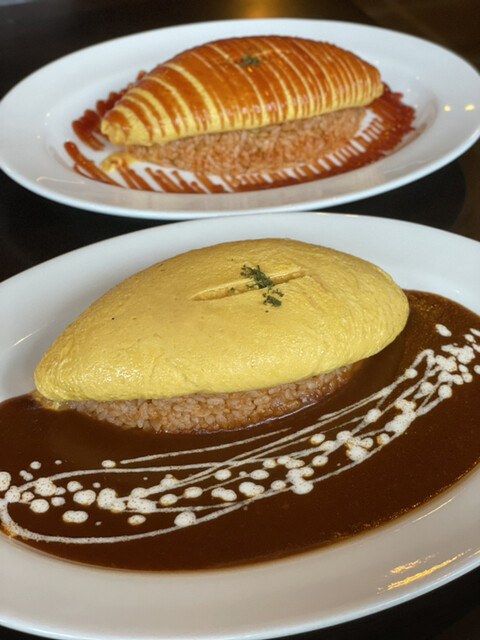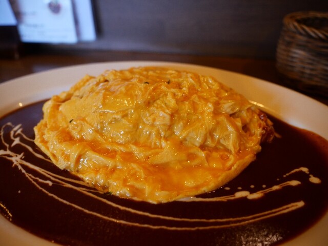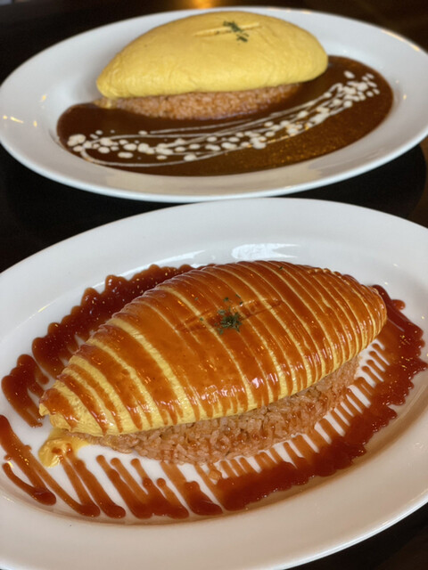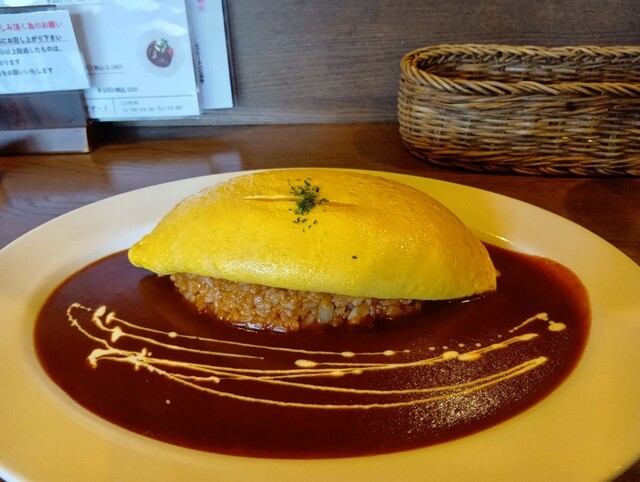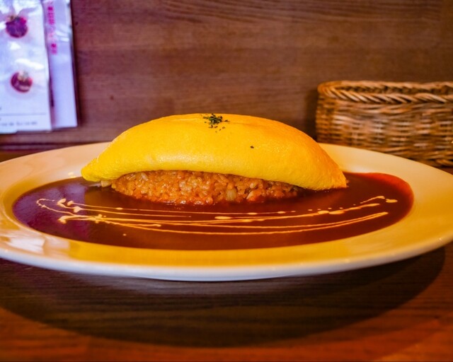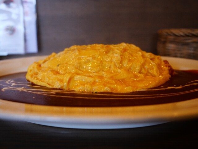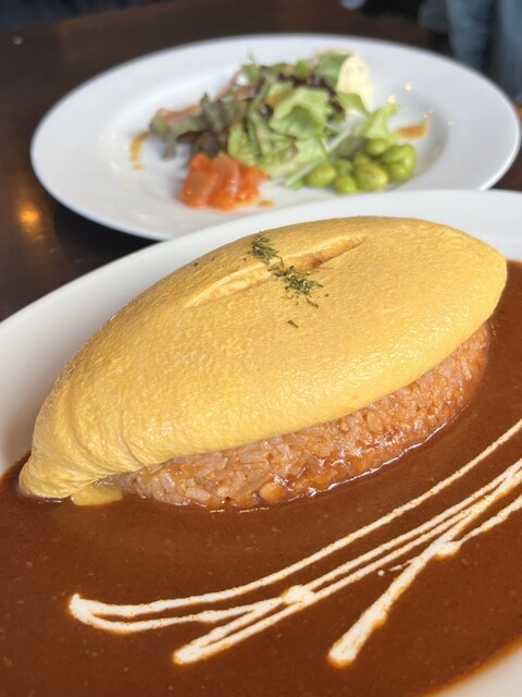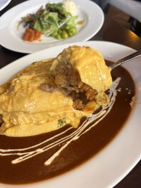 メインのオムライスは、いわゆるナイフで開くタイプ。ふわとろ卵がとろける瞬間は視...