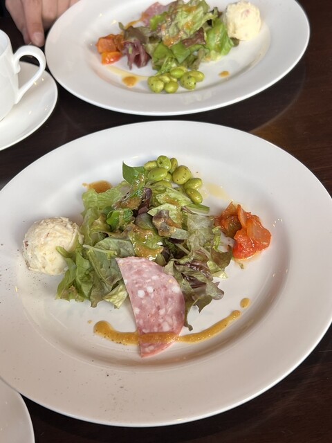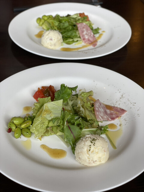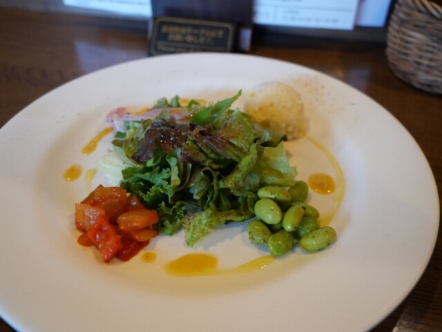 サラダ、枝豆、ラタトゥイユ、ポテトサラダなどが少しずつ盛り付けられ、彩りも良く食欲をそそります。丁寧に仕上げられており、序盤から好印象。