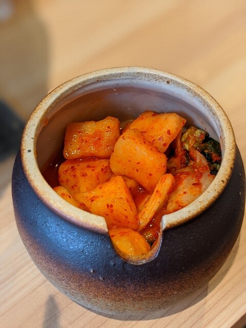 このキムチははじめに500円払えば食べ放題なんです。白菜だけやなくてカクテキまで入ってる。
