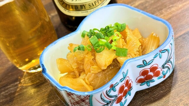 とりあえず瓶ビール、お通しはキャベツの煮物。