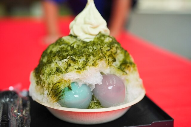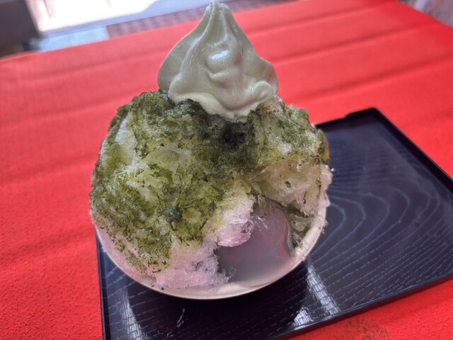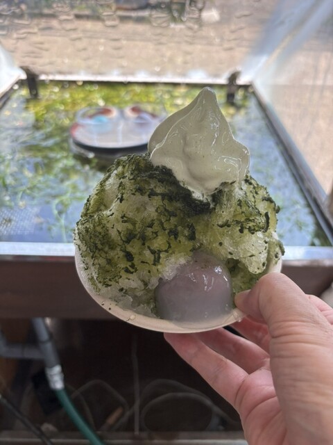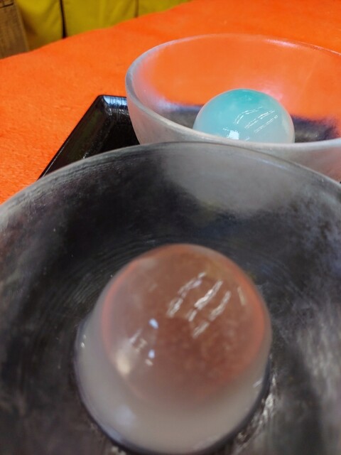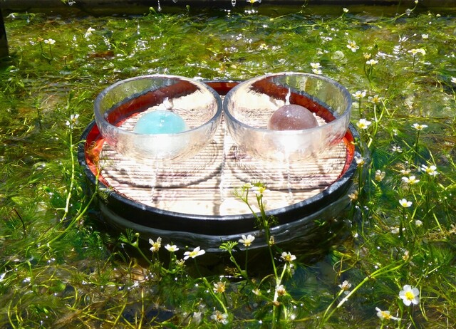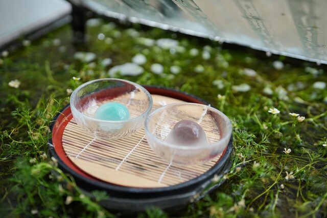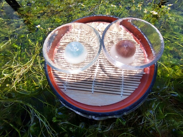 梅花藻の上にお盆を浮かせて、そこにガラス容器に入った水まんじ...