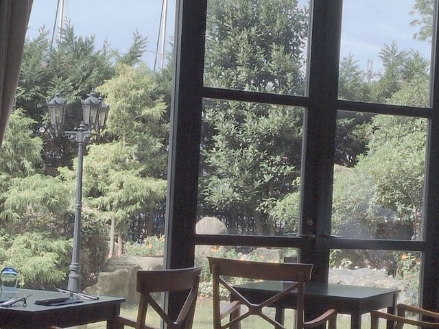 ヨットの帆が見えるレストラン、ホテルランチをいただく。