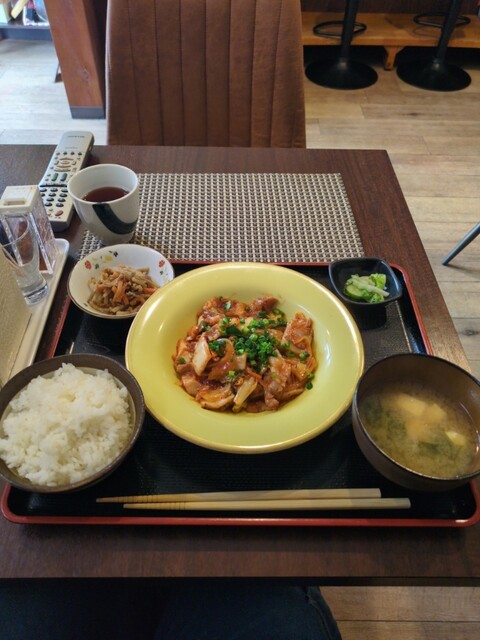豚キムチ定食には、豚キムチ、ご飯、きんぴらごぼう、きゅうりの浅漬け、みそ汁が付きます