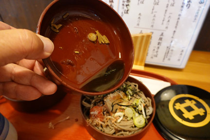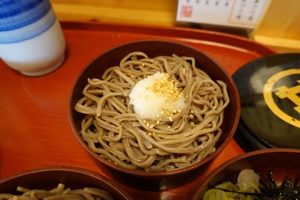 蕎麦は色が黒く風味が高く、腰がしっかりしている。割子だしは、そばの味に負けない辛めの仕上げ。名物の鴨南蛮は蕎麦と新鮮な臭みのない鴨肉とネギ、そしてコクのある出し汁がうまい。