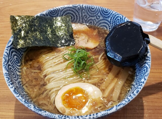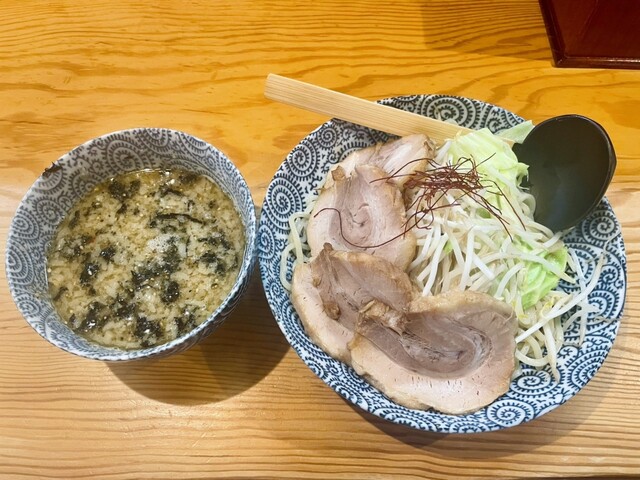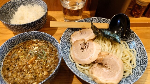 お並びから店内チケット購入後お姉さんにオーダー。暫し待ち熱々の出汁と太めのつけ麺が着丼。濃厚な色合いの出汁の中には玉子、チャーシュー、メンマが入っている。濃い茶色なので想像通りの濃厚で複雑な味わい。結構煮干し感がありありです。麺は程よい温度で流水でシメてあり、食べやすく盛られ、小...