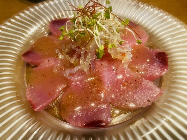 カルパッチョにはトッピングで海藻麺、何かのスプラウト、糸唐辛子が乗ってまし...