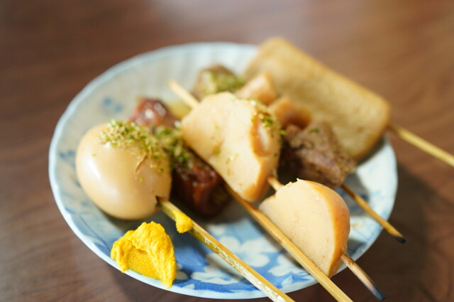店先には「おでん」の暖簾が掲げられた、どこか懐かしさを感じさせるレトロな外観。引き戸を開けて店内へ入ります。