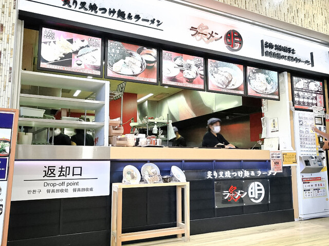 静岡県伊東市を出発し、新東名高速道路を通って休憩と昼食のためにNEOPASA静岡に寄りました。行きも上り線でしたがNEOPASA静岡に寄り昼食をいただきました。帰りの昼食もNEOPASA静岡になりました。3店で注文した料理を二人でいただきました。その内の1店が炎ラーメン明でした。行きに寄ったNEOPASA静岡上り線の方が人は多いように感じましたが、まぁまぁな混みようで、テーブル席には座れなかったため、相方と並んでカウンター席に座り食事をしました。その席から見えたのが炎ラーメン明で、店舗上部の表示板に浜松餃子の表示があったので、おかずの一品にしようと思い注文しました。