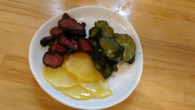 きゅうりの漬物が二種類にタクワンという取り合わせでした。