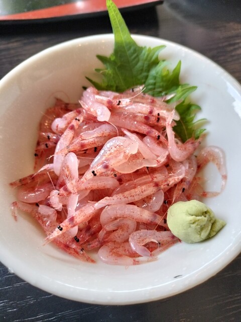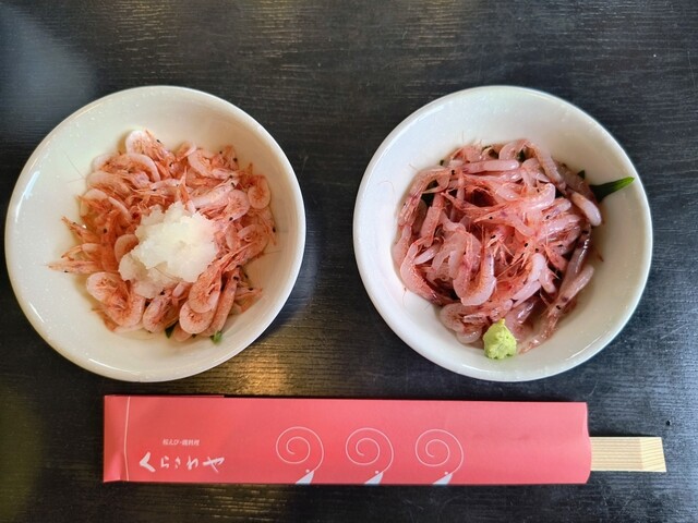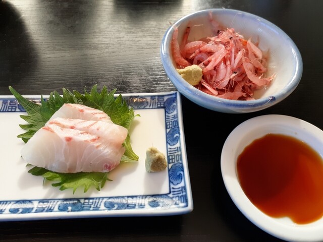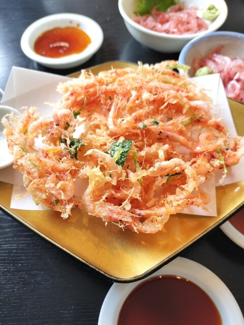 当店は高台にあるので、窓を開けると駿河湾や伊豆半島が見渡せます。由比の特産物・桜海老を使ったかき揚げや釜揚げが人気の「桜えびづくし」は4200円。新鮮な地魚を使った「刺身定食」2100円や、かき揚げと刺し身が一緒に楽しめる「由比の浜」3150円もぜひどうぞ。予約なしでも入れます。