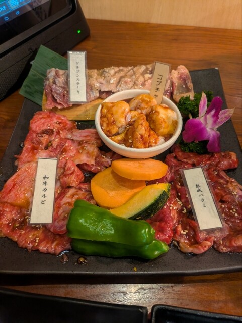 テーブルとソファーが広がり、タッチパネルで注文するとロボットが運んでくれ楽しくゆったり焼肉が楽しめました。平日限定のセットを中心に、単品で頼んだ火の国シーザー...