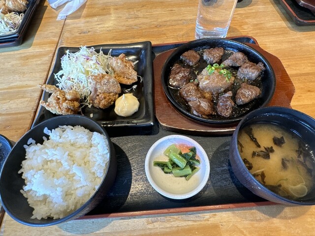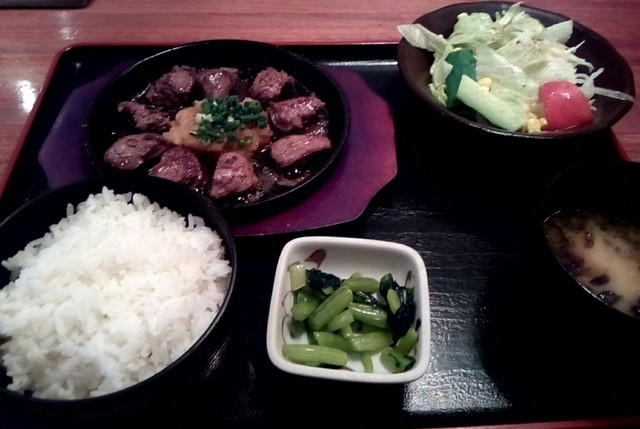 柳通りから船越バイパスに入って北へ300m程。 進行方向北→南側にある和食レストラン「天狗 船越店」さんに 行って来ました。 店内はテーブル席・カウンター・座敷席と広く、 駐車場も広い。 メニューも豊富でランチは日替わり\580~とリーズナブル。 そんなランチから「牛ハラミの和風ステーキセット」\680を頂きました。 牛ハラミはガーリックチップがたっぷり乗ったステーキ。 鉄... 詳細を見る