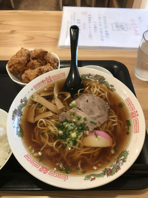 午前中暑くて部屋にいるのも辛くなって来た。ガンガンにエアコンを効かせてドライブに都田ダムまで突っ走る。道幅の狭い木漏れ日溢れる峠道を、麁玉からぐるっと回って引佐まで出る。なかなか楽しいドライブだ、こんなにもいいルートがあったとは。山から降りて来て都田に戻り、かもちゃんに立ち寄ってドライブ終了だ。店の前に到着。あれ?歩道の段差が車の行く手を阻む。あれ?歩道の切れ目も無い、駐車場は?うむ、解らん。裏にまわり走るもどこがかもちゃんだ?解らん。もう一回表、解らん。もう一回裏、あっこの玉砂利の空き地が駐車場か!よく見たら、食事処ののぼりが!これだ、車を止める、よく見るとおもてに抜ける小さな坂道。いやぁー、これは新しいわ。店内に入ると手狭な店内、先客4人でもう賑やかだ。テーブルに座り、唐揚げらーめん定食850円を注文。やっ、安い!らーめん、唐揚げ、ご飯に漬物が付いてこの価格、嬉しいところだ。