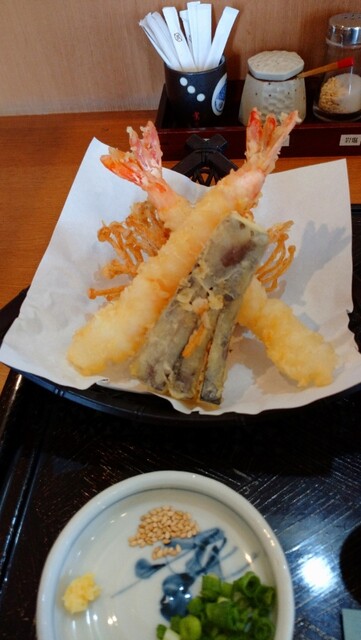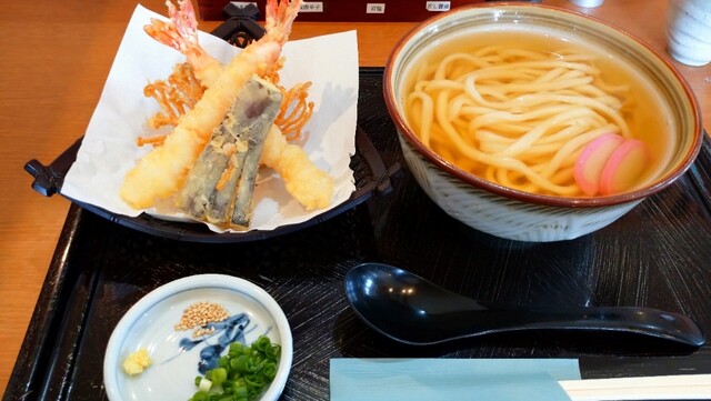 11:00、開店と同時に入店、店内は広くきれいで、わたしは一人だったのでカウンター席に案内されます。かけうどんの天麩羅セット、海老天1,200円也を注文...