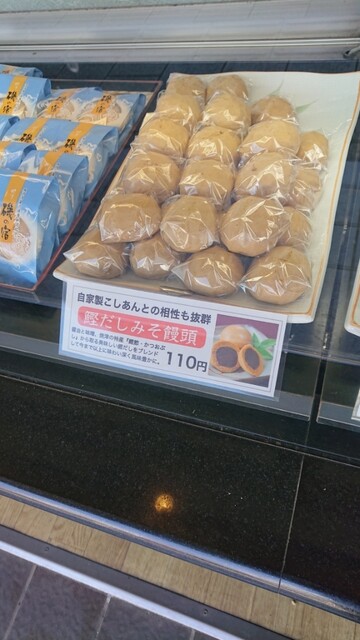 焼津駅近くの商店街に立地する、和菓子屋さんです。4月上旬の週末お昼頃の時間帯に訪問しました。店頭のショーケースには、おいしそうな和菓子が並んでいました。その中から、饅頭数点を購入。そのうち、「鰹だしみそ饅頭」は、醤油と味噌と鰹節をブレンドした出汁を用いているとのこと。案外風味豊かで、おいしかったです。ごちそうさまでした。
