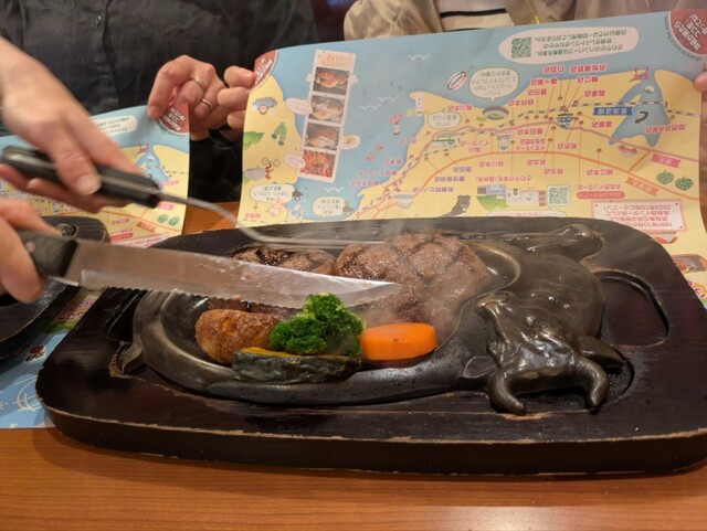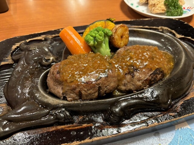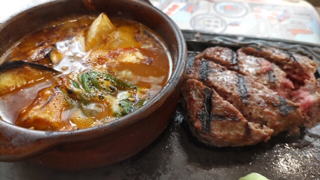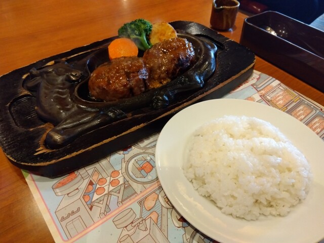直ぐに野菜スープが運ばれ、スープをすすりながら待つこと数分。おにぎりハンバーグが牛の形の鉄板に乗って到着。お店の人にお任...