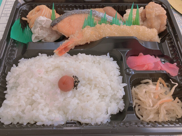 テイクアウトでお弁当。 550円で具だくさん、 ただし、全体茶色です(笑) おかずは本当に種類が豊富で、 焼き鮭とエビフライはとっても美味しい。 それに加えて唐揚げ、卵焼... 詳細を見る