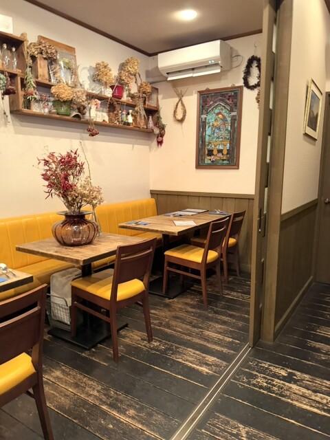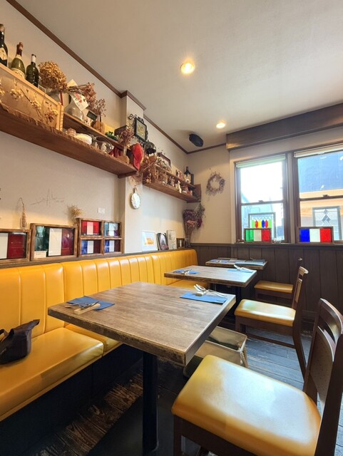 ワインボトルやステンドグラス、洋書、ドライフラワーなどが並ぶアンティーク風な雰囲気で、ゆっくりした音楽が店内に流れる癒される空間♪