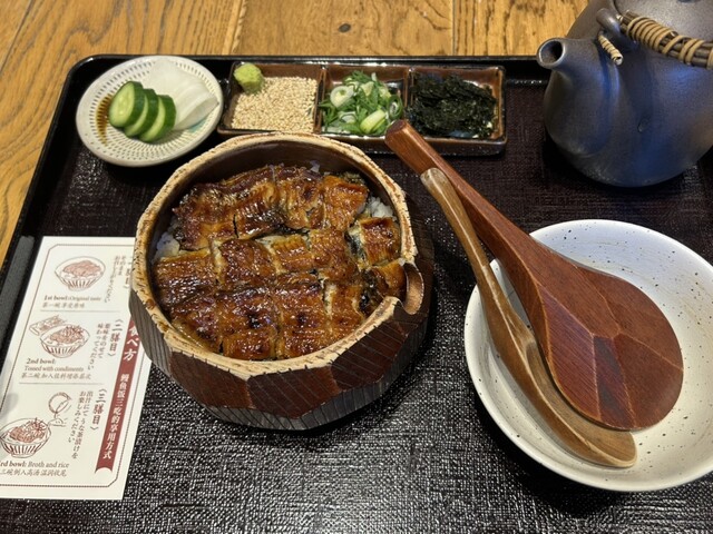 うな重とひつまぶし、うざく、うな肝とお酒を注文。