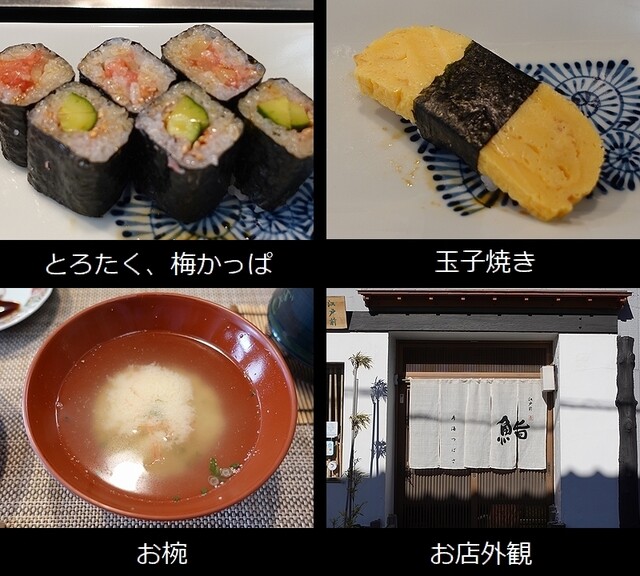 とろたく巻き、梅かっぱ巻き、玉子焼き、お椀