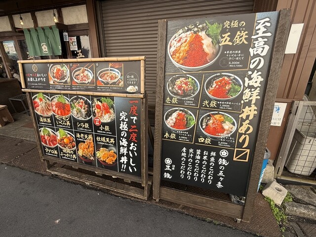 平日のお昼過ぎといことで比較的どこのお店も空いている、開店していないお店もちらほらと、休日の賑わいほどはないみたい、海鮮丼たべたくて、海鮮丼専門店のこちらの店にきました、究極の五鉄の丼を注文、値段も究...