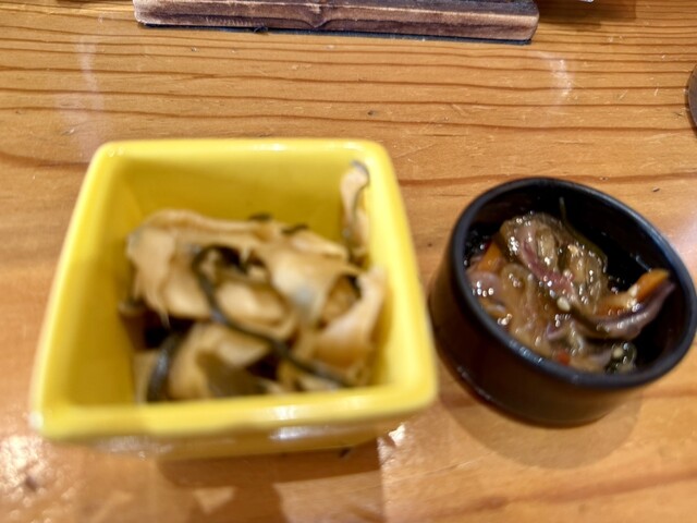 つきだしにガリのような漬け物と松前漬けを出して頂き嬉しかったが、運転のためお酒が飲めず残念。