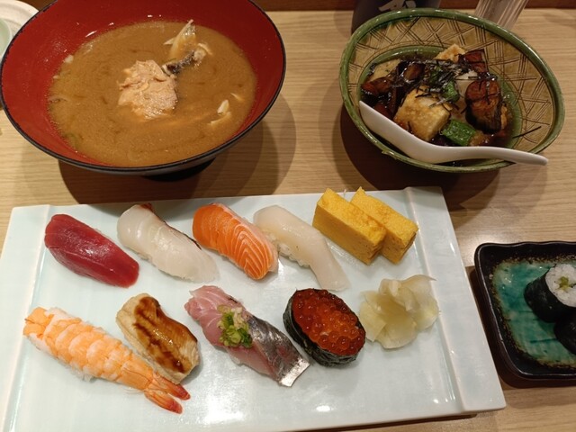寿司と茎わさび巻、あら汁、茶碗蒸し、揚げだし豆腐を注文。