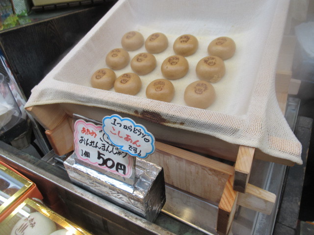 商店街に入ってすぐのお店から、温泉饅頭を蒸かす白い湯気が上がってました。