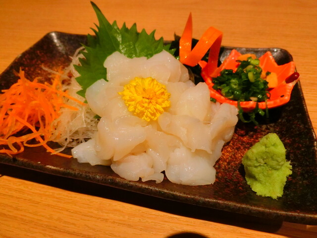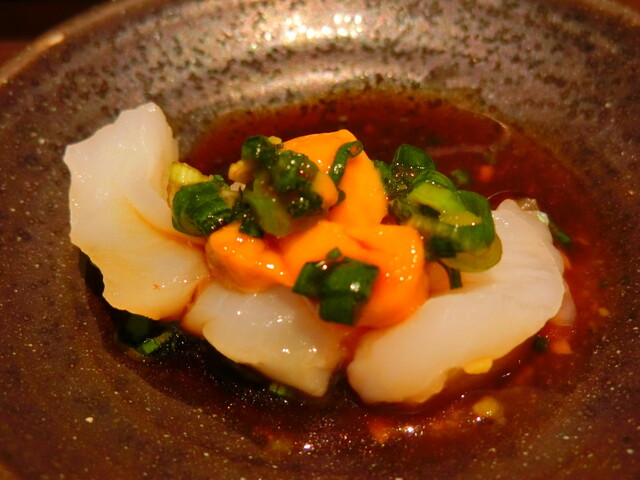 マンボウの刺身は、プリプリ食感ながらイカよりは柔らかく、噛むと組織が粗目にほぐれる感じが魚とも肉とも異なる新感覚。付け合わせのマンボウ肝を刻んだモノと一緒に(肝和えっぽく)頂くと、スッキリした身の持つクリヤーな甘味や旨味が一杯に引き立ちます。