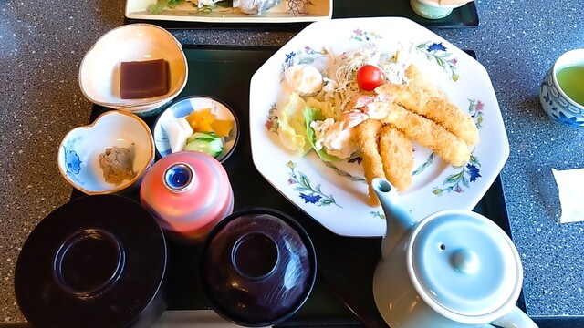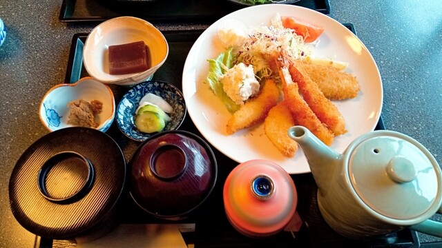 まずフライがちょっと少なく感じた。エビフライが2本、アジフライ、カマス?のフライ、あとイカフライ。