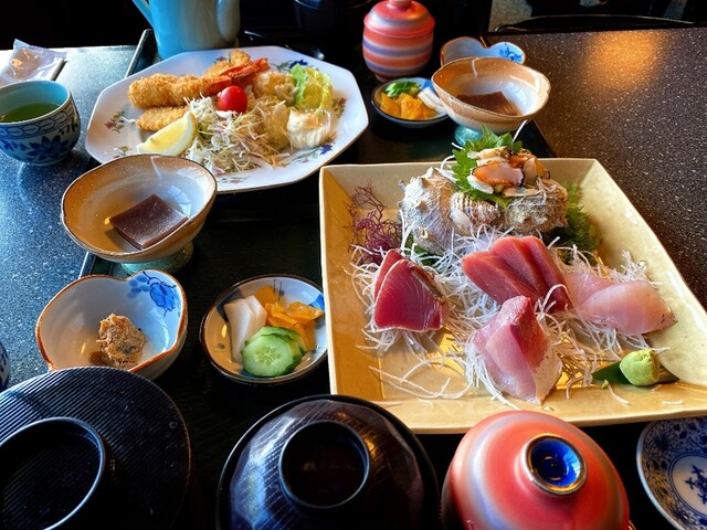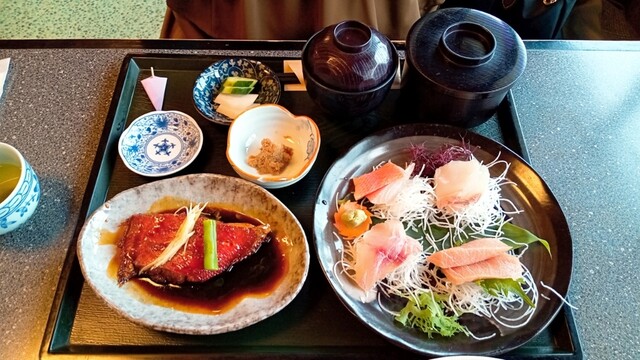 今回頼んだのはミックスフライ定食2200円と、妻が煮魚(金目鯛の煮付)と刺身のセットになった定食2400円。